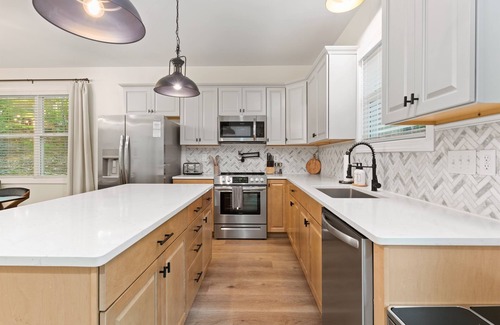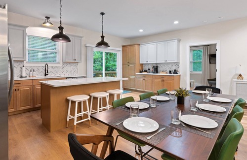 ✔ Kitchen: Our fully-equipped open-concept kitchen with island seating includes all the basics plus a 12-cup coffee maker with whole-bean coffee and grinder, french press, electric kettle, assorted tea bags, creamers & sugars, toaster, cocktail shaker, muddler, pourers, bottle openers, pots & pans, slow cooker/crockpot, knife block, cutting boards, cooking utensils, measuring cups & spoons, mixing bowls, colanders, serving platters & bowls, blender, hand mixer, baking trays & dishes, vegetable peeler, potato masher, ice cream scoop, can opener, cooking oil, spices, etc. Check out the convertible high-chair/booster seat in the hall closet!