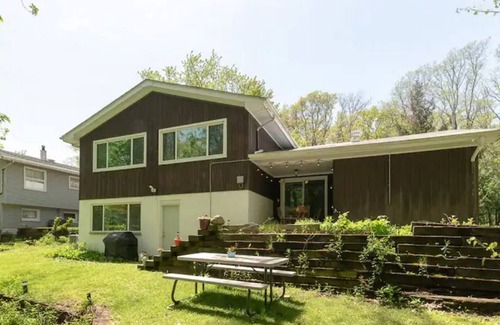 This is a split-level home with stairs and a terraced back yard overlooking a deep, wooded ravine. Unfortunately, it is not suitable for folks with impaired mobility, crawling infants or toddlers. Children over 5 are welcome with close supervision!