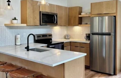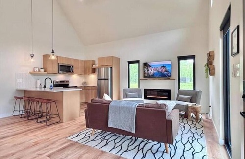 The kitchen is equipped with modern appliances, a table for dinner or games, or bar seating. Cozy up on the couch by the electric fireplace which adds touch of ambiance and glow to the living space, complemented by entertainment options on a smart TV.