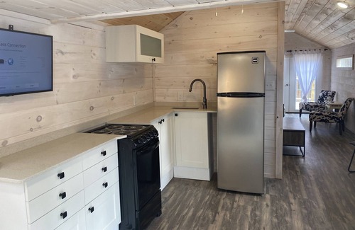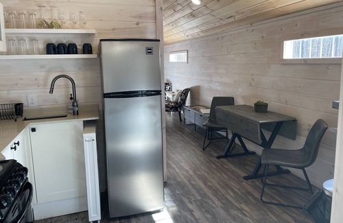 Inside the pet friendly Tiny Home you’ll find a warmly furnished living area, complete with futon sofa and TV. The kitchen area has everything you need to prepare a full meal or simply enjoy a fresh cup of coffee. The kitchen includes a stove, refrigerator, microwave and is also stocked with dishes, glasses, silverware, cooking pots and pans, utensils and basic cooking supplies. Head down to the hall to access the full bathroom, with shower, stocked with ample supplies of towels and body care amenities. The hallway includes a dedicated dining table / office space area with extra storage if needed. Shared laundry facility (with washer and dryer) is located just steps away from the house - please see details below.