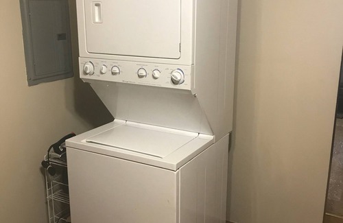 There is a fully stocked kitchen with an in-unit washer and dryer.