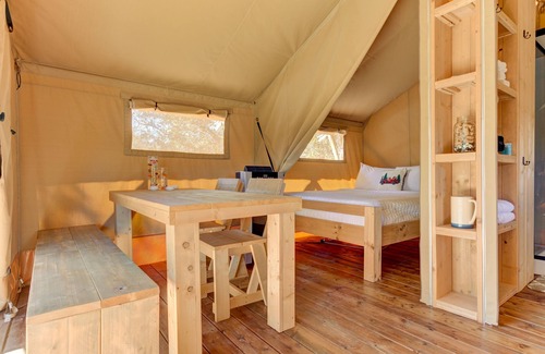 Your luxury glamping retreat "Monte" is thoughtfully designed for a comfortable escape. Snuggle into the plush queen bed, enjoy a private bathroom with a hot shower, and make use of amenities like a microwave, coffee maker, mini-fridge, and wine glasses—ideal for savoring local wines. While the heating and air conditioning ensure comfort to sleep at night, please keep in mind that it's still a tent, so the experience will differ from that of a house or hotel.