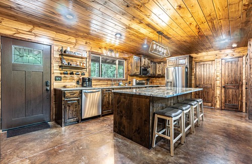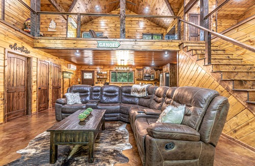 With 2 well-appointed bedrooms and a huge upstairs, our cabin accommodates 10 guests with ease. There are 2 downstairs bedrooms with king beds and en-suite bathrooms. Both bedrooms have doors leading to the large back deck. Upstairs had 3 queen beds, a pool table, arcade games, foosball table, full bathroom, washer/dryer, and a 2nd living area with a smart tv.