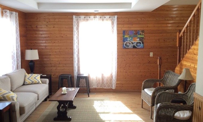 Hillside Cottage sits on the side of a hill. Guests must climb one flight of stairs to get to the main floor. There is a second set of stairs to get to the third and fourth bedrooms.