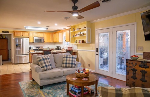 Enjoy the serenity of this 3-bedroom, 2-bathroom home with a spacious open floor plan and a delightful art collection. The perfect oasis for families, it offers a wonderful backyard space with a covered patio for outdoor dining and entertainment. The fully fenced yard ensures privacy and security. Inside, you'll find a comfortable living room with a smart TV, and a fully equipped kitchen featuring stainless steel appliances, pots, pans, blenders, toaster, coffee maker, knives, and more. Your stay here promises to be a delightful and convenient experience!