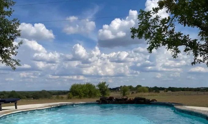 Escape the city and relax at this peaceful getaway. Just over an hour from Houston and Austin. This 3 bedroom, 2.5 bath home is perfect for 2 families. Pool (pool not heated, hot tub heating fee $50/day), patio, grill and firepit to enjoy the sweeping views and constant breeze on the 6 acre property. Open family room tied to the kitchen to enjoy meals. Large master w/ a sitting area when the adults need time apart. Dogs welcome ($50 deposit/dog). Just 15 minutes from Brenham.