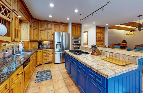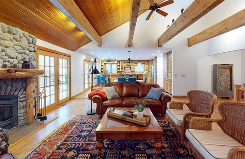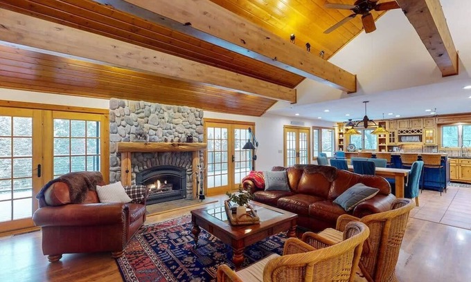 From the moment you walk in, this home-away-from-home envelopes you in comfort and style. The open concept living area boasts wood beams, leather seating, a large stone fireplace which serves as a grand focal point, beautiful windows, and a Smart TV tucked away in a the armoire. A few short steps across the hardwood floors is the dining area with a large table with seating for six and island seating for four.
