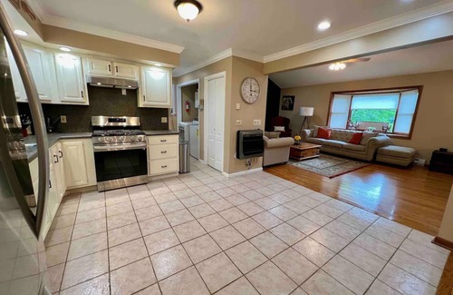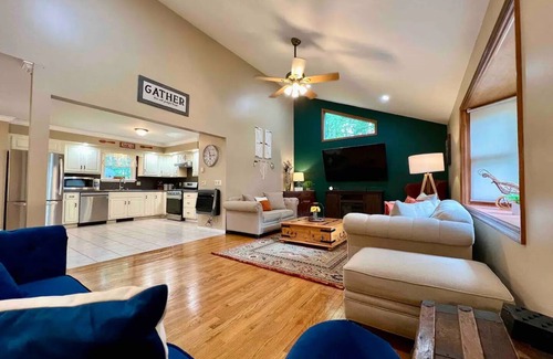 The upper level of HillTop Manor beckons with its open-concept design and abundance of space. The fully-equipped kitchen invites culinary delights, while the adjacent living area sets the stage for relaxation and entertainment, complete with a 75" Samsung Smart TV and a Bose Solo Sound Bar. The dining area boasts a expandable table, accommodating up to 16 guests, ensuring memorable meals and gatherings. The master suite offers a private sanctuary, encompassing a spacious bedroom, a connected bathroom, a walk-in closet, and a sitting area or dresser room for added comfort. Two additional guest rooms, a bathroom, a powder room, and a convenient laundry area complete this level, providing all the amenities you need for a luxurious stay.