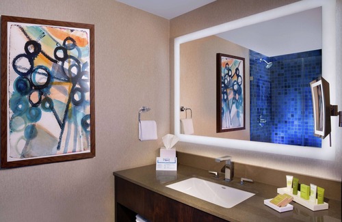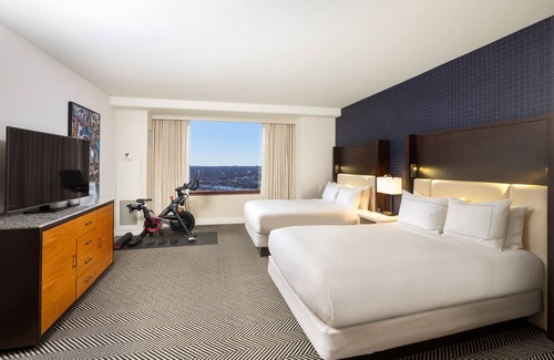 Hilton Austin offers 801 accommodations with fireplaces and laptop-compatible safes. Pillowtop beds feature premium bedding. Flat-screen televisions come with premium cable channels and pay movies. Refrigerators and coffee/tea makers are provided. Rooms have partially open bathrooms. Bathrooms include shower/tub combinations, complimentary toiletries, and hair dryers.