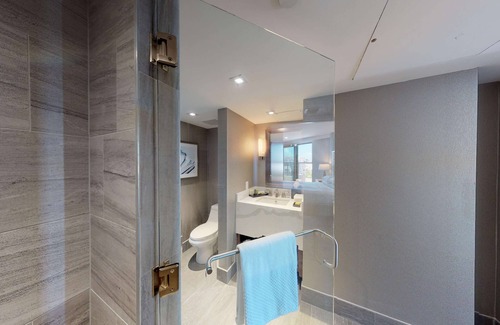 An outdoor pool and a hot tub are on site. Other recreational amenities include a sauna and a 24-hour fitness center.
