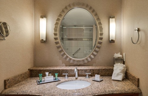 Hilton Washington Dulles Airport offers 449 accommodations with laptop-compatible safes and safes. Pillowtop beds feature premium bedding. Refrigerators and coffee/tea makers are provided. Bathrooms include shower/tub combinations, designer toiletries, complimentary toiletries, and hair dryers.
