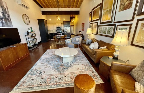 Stay in what once was a 1920's Chevy Dealership. Featuring the original showroom floors, rock exterior, and steel beams this apartment is architecturally pleasing to the eye with its high ceilings and open floor plan. The roomy apartment features a marble shower, double vanities, washer/dryer as well as a king sized bed in the bedroom and closet with storage. Decorated with mid-century and modern design it contains a mix of authentic pieces as well as contemporary.