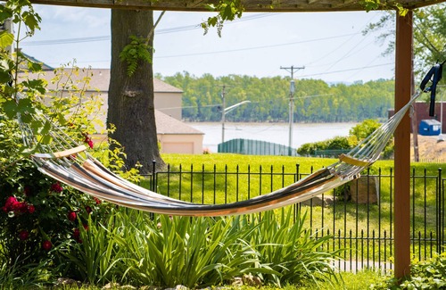 Nestled in the Historic District of downtown Cape Girardeau, the Mississippi Queen offers breathtaking views of the river and the iconic bridge, visible from nearly every corner of the property. Enjoy a leisurely stroll to the Saturday morning farmer’s market, or unwind on the front porch swing as you watch the sunrise over the river. For a peaceful moment, relax in the hammock under a canopy of grapevines, and take in the beauty of your surroundings. This home offers a true holiday escape!