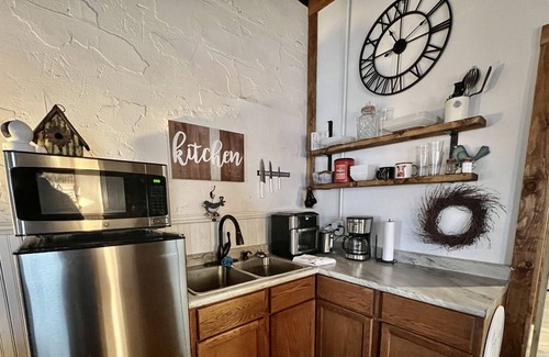 The cozy kitchen comes fully equipped with everything you could need including a small oven, a microwave, a fridge/freezer and a coffee maker along with all the cookware, dinnerware and plenty of utensils.