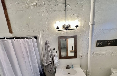 Wash up in the bathroom that offers a large walk-in shower stocked with quality amenities and a vanity with plenty of soft, fluffy towels for each guest. Sliding barn door is original to the home and is over 130 years old!