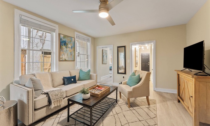Located on the upper level, this space offers a welcoming living room and two spacious bedrooms—one with a king-size bed and the other with a queen-size bed—comfortably accommodating up to 4 guests. Both bedrooms are bathed in soft natural light, creating a warm and relaxing atmosphere. It includes a full bathroom with an in-unit washer and dryer, as well as a large kitchen that opens to a private balcony. The property is further enhanced by its classic brick exterior, elegant wood trim, and hardwood floors throughout, while the updated stainless-steel appliances in the kitchen harmoniously blend the charm of yesteryear with the sophistication of modern living.