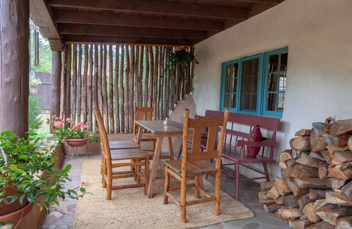 Traditional Taos home built by Pueblo builders for renowned Taos artist Charles Reynolds and his wife Ruth. Home is furnished with original antiques and paintings from the era. It is located on a quiet tree lined street, walking distance from Kit Carson Park, historic Taos Plaza, and many galleries and restaurants. The large, shady front porch is perfect for an outdoor meal, and the Pueblo of Taos, oldest inhabited village in North America, is less than two miles away. The world class ski resort of Taos Ski Valley is a twenty minute drive north, and the spectacular Rio Grande Gorge, with whitewater rafting, fly-fishing and hot springs, is even closer. Come immerse yourself in the real Taos, with it's amazing natural beauty and it's unique cultural influence, unlike anywhere in the USA. The larger side has two bedrooms and a day bed in the living room, and one twin in its own cubby, and one full bath. Sleeps five guests maximum. Prices listed are for the larger side of the duplex. If more space is needed please let me know. Likewise, if your group is small you may want the smaller apartment. Please take a look at VRBO #969436 to see the other side of this duplex. It has one bedroom with a queen size bed, and two twin beds. It sleeps four comfortably. For larger parties of up to nine the entire home can be rented.