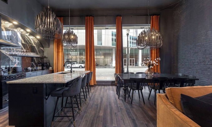Welcome to Hollyhock Market Street Suite 1, a luxurious urban retreat perfect for discerning travelers, business professionals, and families directly across the street from the Louisville Convention Center!.The suite features dark wood flooring, elegant gray walls, and opulent bathrooms with beautiful gray walls, brass fittings, and Art déco cabinetry. Each uniquely designed bedroom adds charm and comfort.
