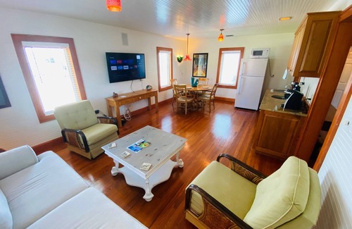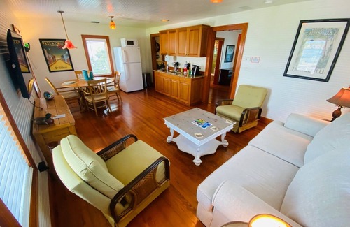 The upstairs 2nd floor one of a kind rental has one flight of stairs from the ground level to front door, and comes fully equipped with the look of yesterday in pristine well kept condition with all of today’s modern needs and wants. The unit sleeps 4, best for 2 adults, or 2 adults and 2 kids, or 2 adults and 2 small adults. King bed and queen air mattress. You can sit at the dining table or in the living room and look right out the windows to the intercoastal waterway and beautiful sunrises. We have everything in the kitchen you need except an oven. Yes, we are a smart rental, smart tv, Alexa, and Wi-Fi awaits you for your work or staycation. We have Hulu. We have added outdoor sitting areas for your outdoor enjoyment. We look forward to your stay.
