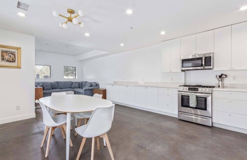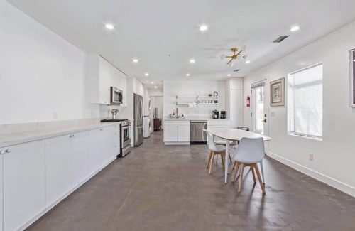 Step inside to polished concrete floors, crisp white custom cabinetry, and stainless steel appliances, creating a sleek yet inviting atmosphere. The spa-inspired bathroom features a tiled glass shower, providing a rejuvenating experience after a day of exploring the city. In the King bedroom, you’ll find a Smart TV and a ceiling fan, ensuring both entertainment and comfort.