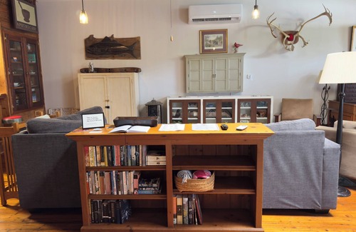The Great Room features a Queen size bed, large sofa, 50” TV, large dining table that can accommodate six people comfortably, and desk with dedicated work area. There are many pieces of art on display created by local and regional artists, usually on a rotating basis. We also offer fiber optic internet and WiFi. There are a large variety of books for those who love to read and a plethora of games to play, as you sit around our oversized living room table.