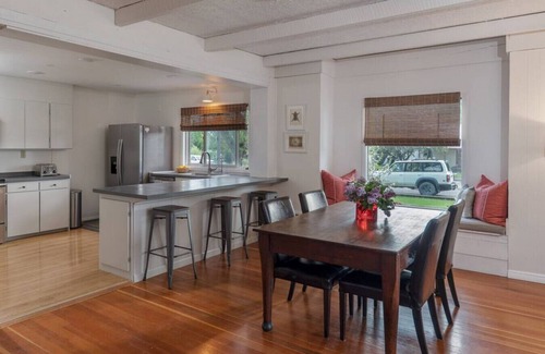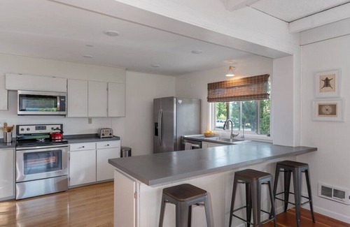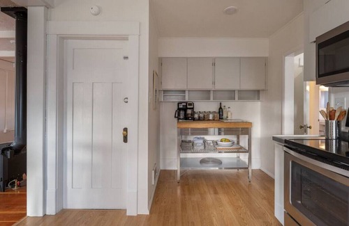 Inside, the home has beautiful heart pine flooring, original built in shelving throughout, and many renovations making the home a perfect combination of old and new. The home has 2 bedrooms, and 2 full bathrooms. The Master bedroom has a King sized bed and the second bedroom has a queen bed, all with tempur pedic mattresses and a fluffy down comforters to snuggle into each night. A Pack'N'Play is available for the little ones in your group. Down the hall are the two bathrooms, one with 2 dual vanities and a stand up shower and the other with a tub/shower combination. A full size washer/dryer is available for guest use during your stay.