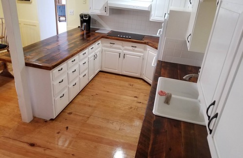 This unique Limestone house was constructed 80 years ago from stone quarried from the property. The house sits on 20 acres and is very private. It was added on and the interior remodeled in the 1960s and just again in late 2019. It is bordered by a park on one side and HaHaTonka State Park on three sides. It is set on a picturesque bank of the Bank Branch Creek that flows into the Lake of the Ozarks. Except right after a rain, the water is 2 ft to 5 feet deep with little to no current, crystal clear and perfect for swimming , kayaking and fishing right outside your door! You can Kayak right into Lake of Ozarks which is a block downstream. There are two double and one single Kayaks , and paddle boards for use at the house. An old iron bridge from the late 1800's completes the setting for this retreat.