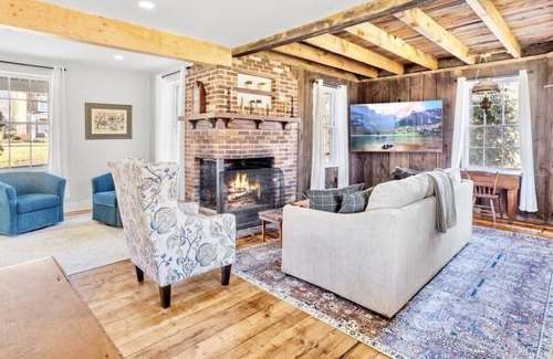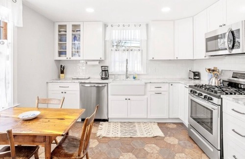 Recently renovated historic home beautifully furnished throughout, this spacious and private 1930's two-bedroom farmhouse features a traditional floor plan with an upscale kitchen, dining area, dedicated workspace, and a living room with 75” Smart TV.