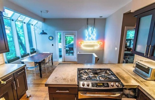 The interior architecture abounds with elegant details . The large kitchen is fully equipped allowing you to cook and share meals together. Feel free to eat casually in the kitchen (seats 6) and gaze out at the acrobatic squirrels (our favorite spot!) or in the separate dining room that looks out to campus (also seats 6). We have all modern appliances, a good tea selection, and multiple options for brewing coffee.