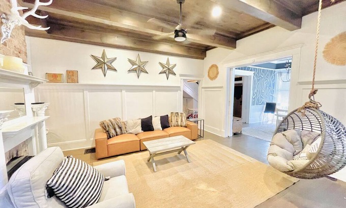 Get ready for an unforgettable group getaway in style! This newly renovated 5 bedroom, 4-bath Victorian beauty boasts a vibrant, eclectic interior that's sure to delight. With an 8-person hot tub, 12' ceilings, and original heart pine floors dating back to 1900, you'll be surrounded by history and charm. Each of the massive 15'x16' bedrooms rocks 12' ceilings, setting the stage for comfort and grandeur. A dining table that seats 12+, a dreamy covered screened front porch, and a spacious kitchen with a Restoration Hardware entertaining island and Carrera Marble countertops are all part of the package. The open floor plan living area is crowned by a 65" Roku TV and exposed brick fire place – making this spot prime for relaxation. Plus, it's perfectly positioned close to Downtown Atlanta, just off the highway.
