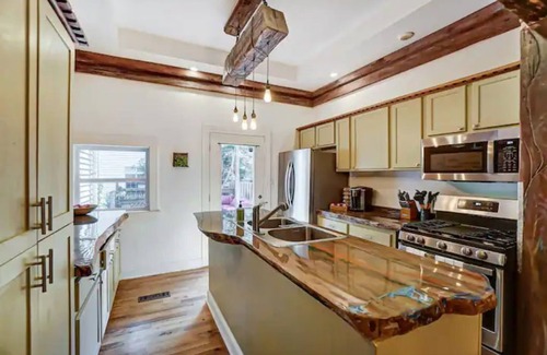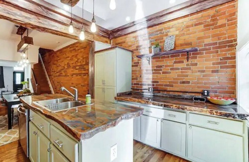 The historic and comfy getaway will leave you in awe with its carefully picked amenity list spread over three inviting stories. Stylish wooden floors extend throughout the entire house.