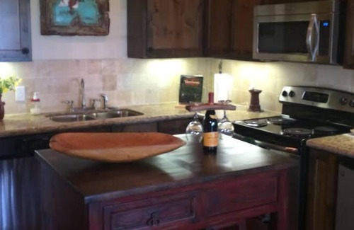 Full kitchen with all of your cooking needs and wood/charcoal grill . Grocery store 7 miles away in a Franklin. Closest liquor stores in Bryan-College Station.