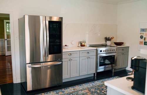 A recently refreshed kitchen lends itself perfectly to preparing delicious meals and memories, whether it’s making them yourself or letting others make them happen for you. Dressed in soft grey and featuring white marble countertops and open shelves, it imbues a timeless country cottage-feel refined with modern details and accoutrements. For dreamy morning rituals or afternoon pick-me-ups, you can also find a Nespresso coffee machine.
