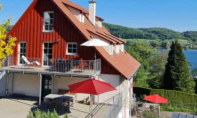 in a unique feel-good atmosphere you will find in our quiet and spacious apartments with stunning views of the Untersee. Visible truss, mud walls with earth tones of natural pigments, antique furniture with exquisite detailing and hand-painted Art pictures by the owner give a special feeling of warmth and comfort - cottage idyll.