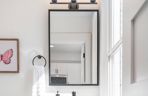 There is one full bathroom on the second floor with a luxe walk-in shower that caters to both bedrooms, plus a convenient half bath accessible from the living area on the first floor. Both are stocked with 100% Turkish Cotton white towels and essential toiletries to ensure you have a carefree stay.