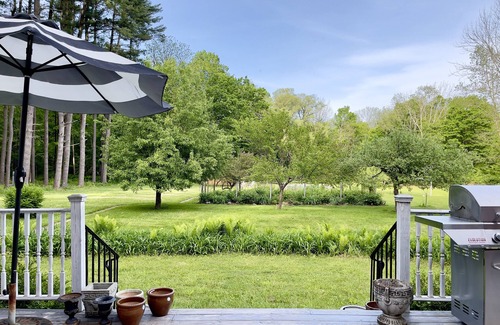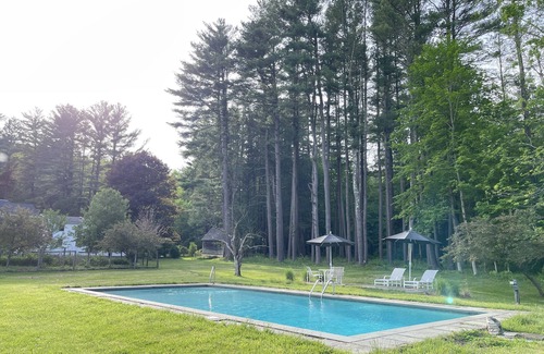 Historic fully updated brick house originally built in 1812 in the Berkshires in Western Massachusetts on one of the prettiest roads in the area. Minutes from Great Barrington and close to borders of Connecticut and New York, the spacious house sits on 10 quiet acres with swimming pool and patio, large deck with retractable awning, seating for many, chaise lounges, dining table, grill.
