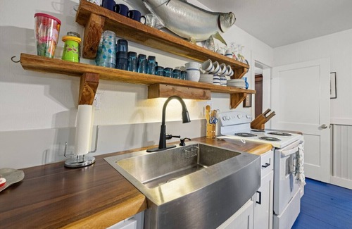 Kitchen: Fully updated with polished wood counters, open shelving and everythign you need for dining at home.