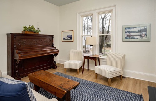 On a rainy day, curl up with a captivating book next to the fireplace in the music room, allowing the gentle warmth to envelop you in comfort. Craft culinary masterpieces in the well-stocked kitchen, while loved ones gather around the expansive island. Embark on a leisurely stroll to nearby wineries, breweries, and distilleries for an exquisite post-dinner tasting experience. Alternatively, savor the locally made kombucha at the Komorebi Brewery and Herb Shoppe. And when summer arrives, indulge in the tasty treats offered by Lynnie Lou's homemade ice cream stand.
