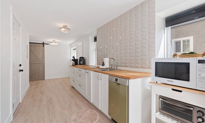 A ground floor unit with sink dishwasher without a stove in a craftsman style heritage home with double French doors, open concept the bedroom. A indoor bar area, air fryer, kurig coffee, slow cooker, fridge, black out curtains ,extra pillows and blankets and books to read. 5 minute walk to commercial drive or 10 minutest to downtown, respectfully acknowledges that we live work and