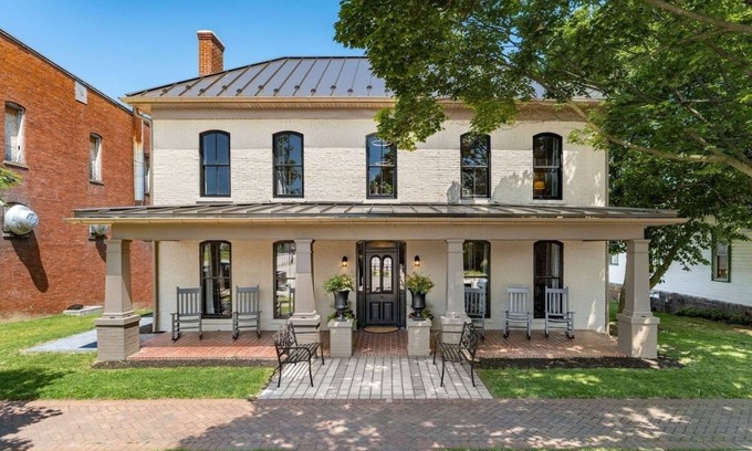 Welcome to The Pigfoot Inn, located in the heart of historic downtown Somerset, Ohio. This spacious retreat features 2 king suites and 3 queen rooms, each equipped with a private bathroom. Enjoy a full kitchen, fire pit, grill, hot tub, sauna, and cold-plunge pool—lounge on our spacious front and back porches. With walkable access to local shops, dining, and landmarks, it's perfect for family stays, group getaways, or small events.