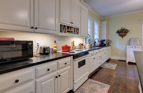 KITCHEN: Dishwasher, stove/oven, refrigerator, microwave, toaster, coffee maker + grinder, cooking basics, Crockpot, dishware + flatware, trash bags + paper towels, complimentary spices, bar seating