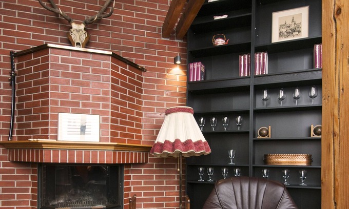 - very spacious living room (70 sq.m) equipped with original antique piece of furniture from 18th and 19 century. Two separate lounge zones with leather Chesterfield couches, armchairs, library, 6 meter high ceilings. Huge 4 meters long dining table. Fireplace.