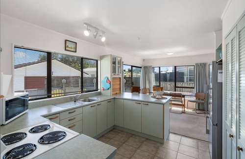 Presenting as a quintessential Kiwi bach from the road, it’s a bright and homely interior that welcomes you when you walk in the door. Traditional decor invokes memories of those good old beach holidays you took as a kid, with the wood burning fireplace, and TV with DVD player, offering the ultimate in home comfort on those mid-year getaways.