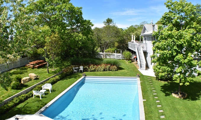 Our home is carefully renovated and furnished throughout with classic white everywhere, replete with beachy antiques and curios we've collected over the years, plus a vast collection of books, many related to the ocean, fishing, and nature. Our home also has two entirely separate living rooms with large flat screens, upstairs and down, so cooking shows on one, sports on the other during rainy days. The half acre property is shrouded in trees on all sides yet has a cozy lawn and a very large and private heated pool, jacuzzi/spa, and air conditioned pool house. A truly luxurious property.
