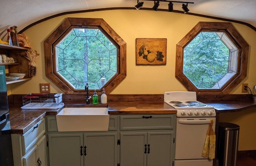 Please note that the driveway up to the Hobbit House is steep and rugged. Two-wheel drive will make it up fine most of the time (except in inclement weather i.e. very heavy rain or snow and ice) but it is bumpy at the best of times. Take the driveway slow and steady until you see Elderberry cabin, and then give your car some speed to get it up the last stretch to the Hobbit House which is the steepest part.