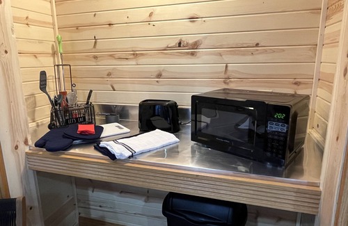 Walk up the stairs in our main building and across the hall and you’re there! Get comfy on the queen size memory foam bed, Get work done in the provided workspace, Relax on the suede memory foam couch, watch Disney+ or Netflix on the Smart TV, or head back downstairs to the game room! Cook out on the shared patio and watch a game on the outside tv (DirecTV or smart stick)!