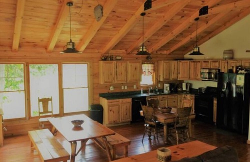 As soon as you walk into our lodge you will see the beautiful fireplace that makes our main living room stand out. From wood floors all the way to wood ceilings - we wanted a cabin feel but with more space for larger groups. The kitchen is fully stocked as if you were at home. There is even a grill for nights that you don't feel like making a mess in the lodge. Satellite TV is offered in the main living room, master bedroom and family rec room. Downstairs is a game room with a Ski Ball Machine, Foos Ball Table, Game Station Arcade and a Double-shot Electronic Basketball Game. Want to be outdoors take a hike or relax in the hot tub. This cabin lodge is great for larger families or groups of friends - something for everyone to do but a peaceful retreat away from the busy city life. If privacy and seclusion is what you are looking for - this is the place to be. You will need to bring your own firewood.