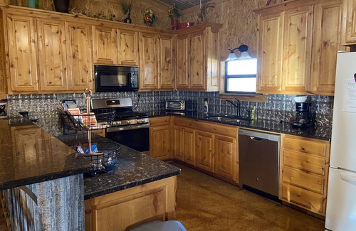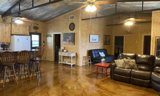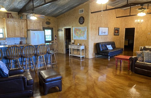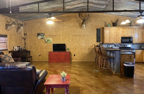 The cozy cabin sits on 20 acres of high fenced land and surrounded by farm/ranch land! We have lots of wildlife including deer, sheep, goats, llamas, peacocks, chickens and a donkies for you to feed, pet or just enjoy! You can see the sun set over the wheat field to the West or watch the sun rise over the animals grazing in the pasture.