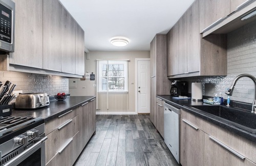 1400 SF renovated unit is 7-9 min away from interstate 90, which takes you straight to O’hare Air & downtown! This property has 3 bedrooms, & 2 full bathrooms. Master suite has a KING, and 2 bedrooms have a Queen. The living room has room for 1 air mattress (Total of 4 beds). Plenty of Kitchen utensils, all you need in a kitchen, including cooking spices and oils! Children friendly & lots of technology!