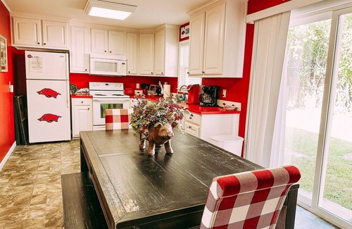 The Hog House is decorated from top to bottom with Arkansas Razorback decor! This beautiful home sleeps 10-12, people, depending on your group. We totally remodeled the home, inside and out, in the summer of 2012. EVERYTHING in this house is Razorback themed or red and white! This 5BR 2BATH home has a fully stocked kitchen, a brand new gas grill, and all linens and towels are provided. The master bedroom has a king bed. Three bedrooms have queen beds. One bedroom has a twin over full bunkbed. The Hog House has a full size washer and dryer, all new appliances, and 7 flatscreen Smart TV's. The house has top speed WiFi. There is a small upstairs room with a beanbag couch, and TV. The back yard of the Hog House is fenced in. The enormous deck on the front of the house is perfect for tailgating or family cookouts. Sit out on the deck after a big Razorback win and watch the excited fans drive by as they leave the game. You'll be back to the Hog House relaxing while everyone else is stuck in traffic! The Hog House is walking distance to Razorback Road where Bud Walton Arena and Razorback Stadium are located. It's an easy walk to the games, less than a mile. You will see hundreds of fans walking this same route.